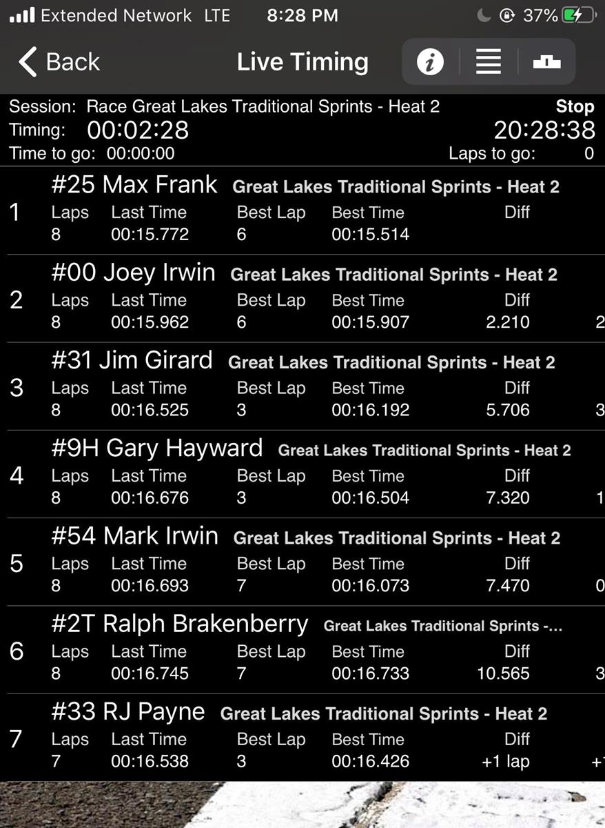 In the Beacon & Bridge Markets Heat 2, long time racer Gary Hayward (Auburn Hills, MI) brought the field to the line as the green flag dropped. As the field completed their first lap, Jim Girand (Manistee, MI) running third, did a full 360 spin and kept going in the bottom of turns 1 and 2. Evidently, liking the spin move Girard did, RJ Payne (Montrose, MI) decided to pull the same maneuver off at the top of turns 3 and 4. In the end, Frank took the checkered for his first heat race win! Joey Irwin, Girand, Hayward and Mark Irwin (Columbiaville, MI) rounded out the top 5.