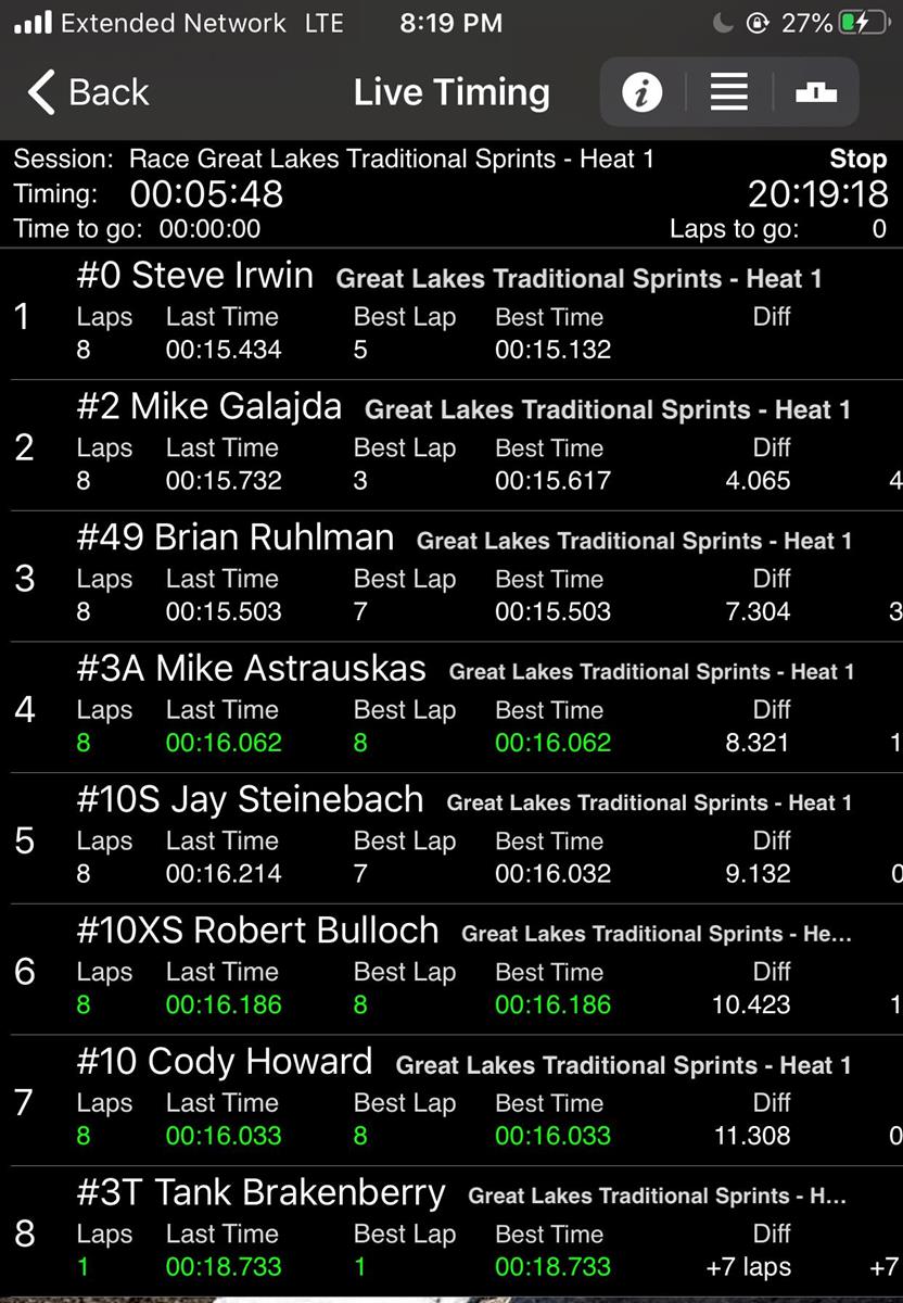 Mike Galajda (Fenton, MI) led out the first group of cars in the Rocket Headers Heat 1. As the green flag dropped Galajda beats everyone into turn 1. With the cars bunched up in turn 1 and headed into turn 2, Ruhlmans car makes contact with another car and Ruhlman ends up kissing a tire and bending his front axle, but is able to continue after being pushed off. With the battle up front between Irwin, Galajda and Astrauskas, the action was in the back of the field as Ruhlman methodically picked off 5 cars and clawed his way into a 3rd place finish and being in the redraw. Irwin took the checked flag with Galajda finishing 4 seconds behind Irwin.