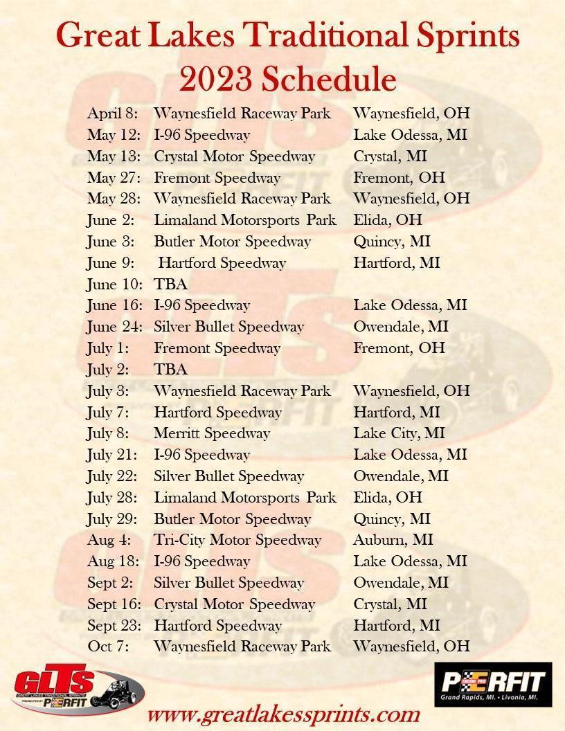 Merrill, MI – The Great Lakes Traditional Sprints presented by PErfit is pleased to present our 2023 schedule. Purses, special events and the Michigan Mini Series will be identified in the coming weeks, but in the mean time we were excited to get our dates out to everyone so you can start marking your calendars!